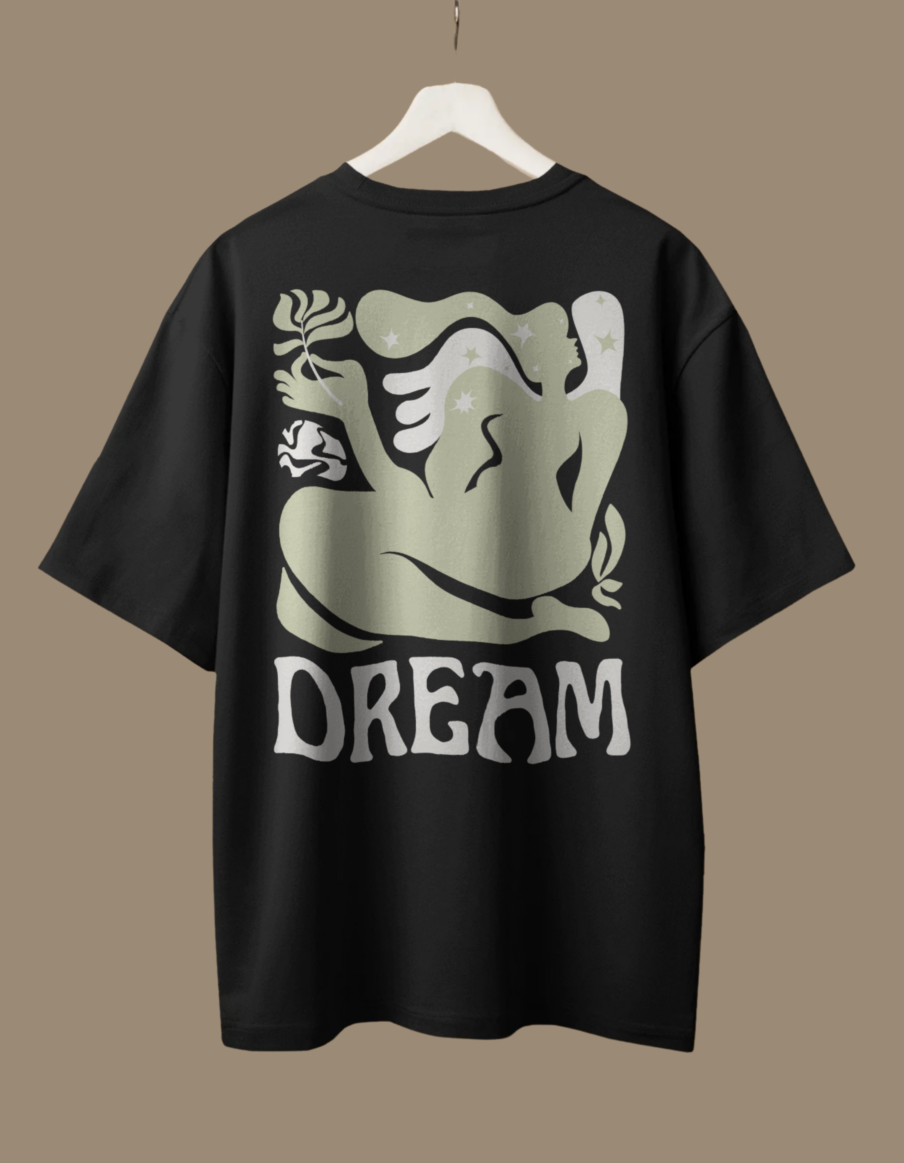 Embrace imagination and flow with the Dream Oversized T-Shirt, an artistic celebration of surreal design and cosmic calm. Featuring a soft, abstract figure with stars and leaves in a dreamy pose, this tee carries both elegance and inspiration. The bold “DREAM” typography enhances the visual while keeping the vibe relaxed and creative.