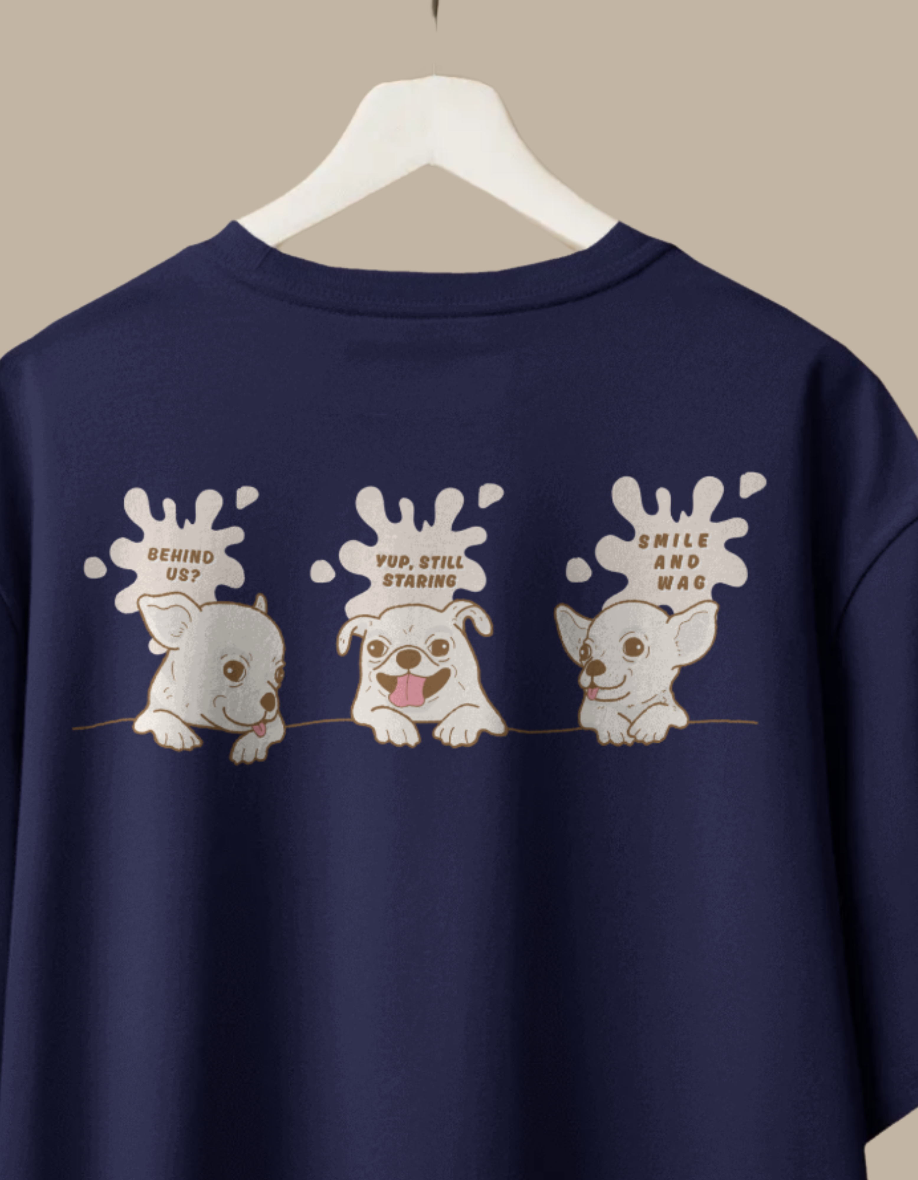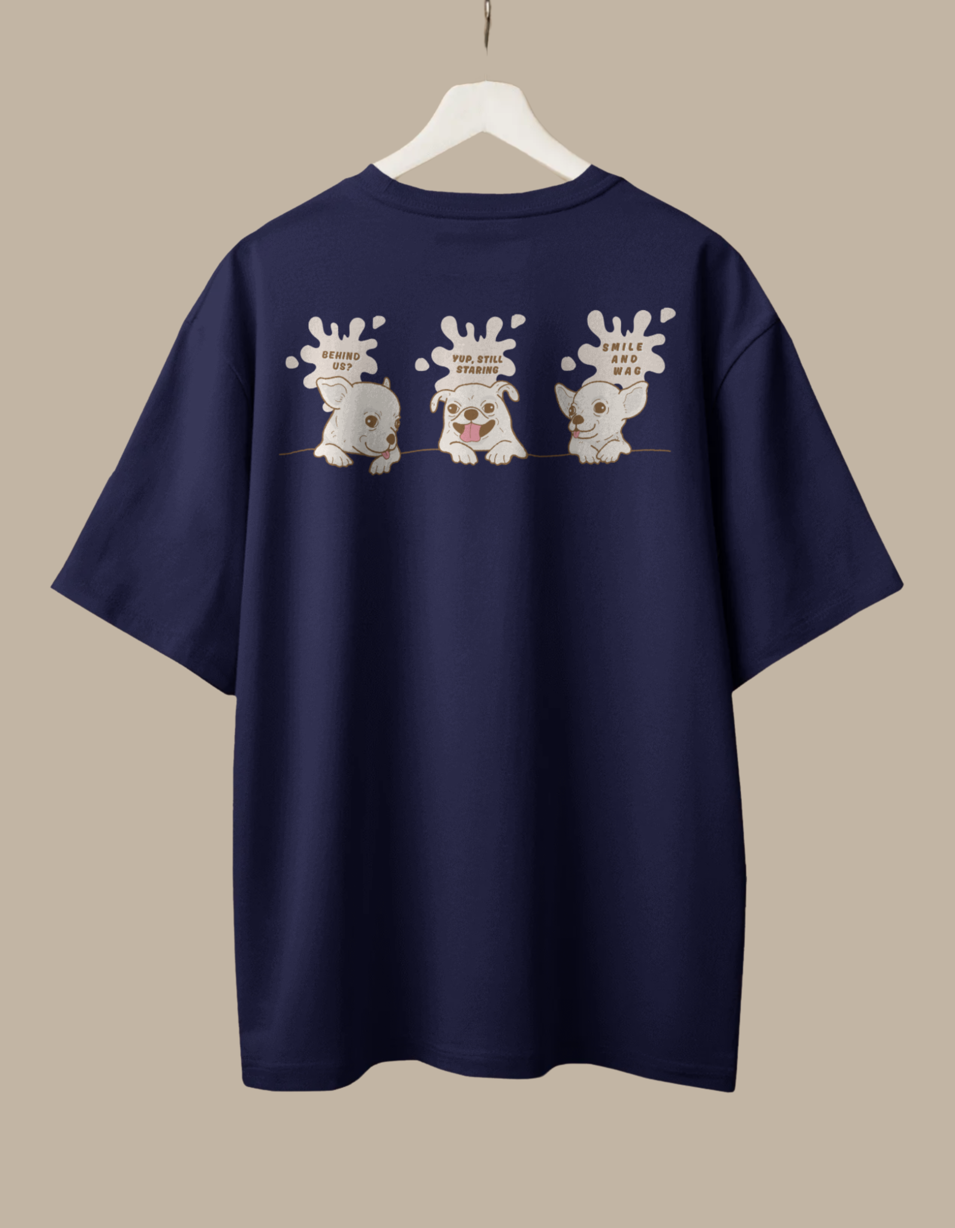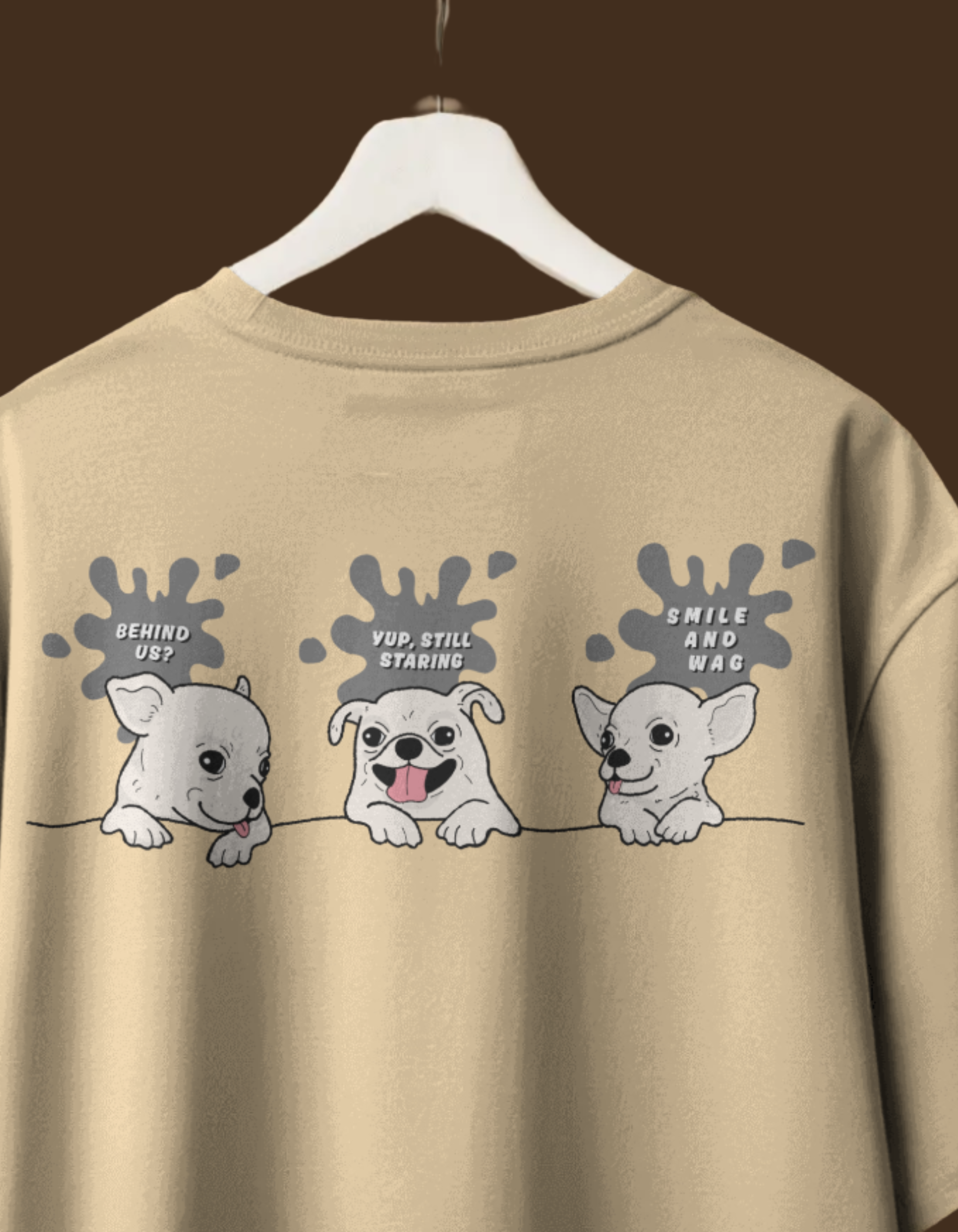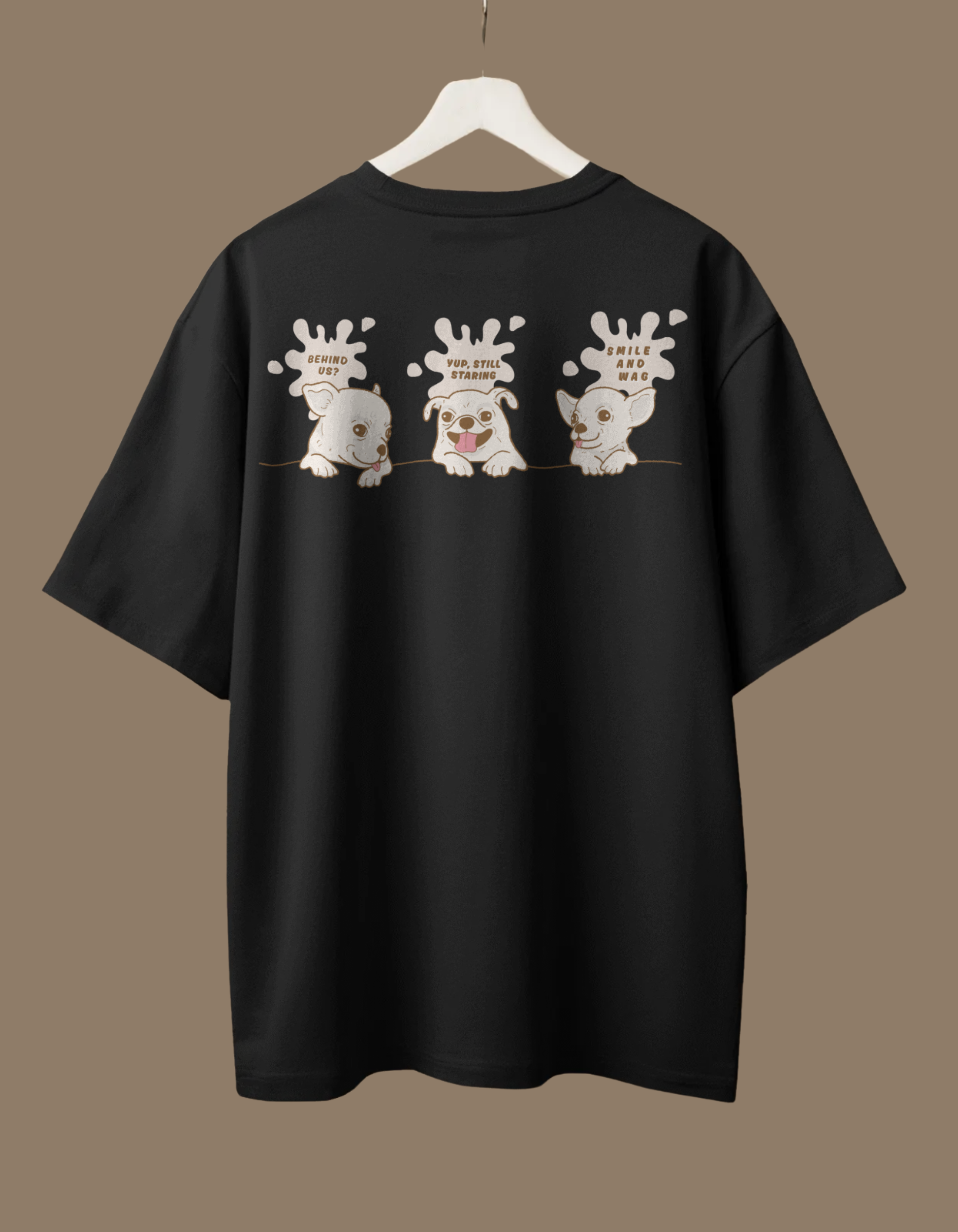 Ever felt like someone’s watching you? Now they are — literally! Our Eyes On The Back oversized t-shirt brings playful paranoia to life with a trio of cheeky dogs watching from the back and bold text on the front.
