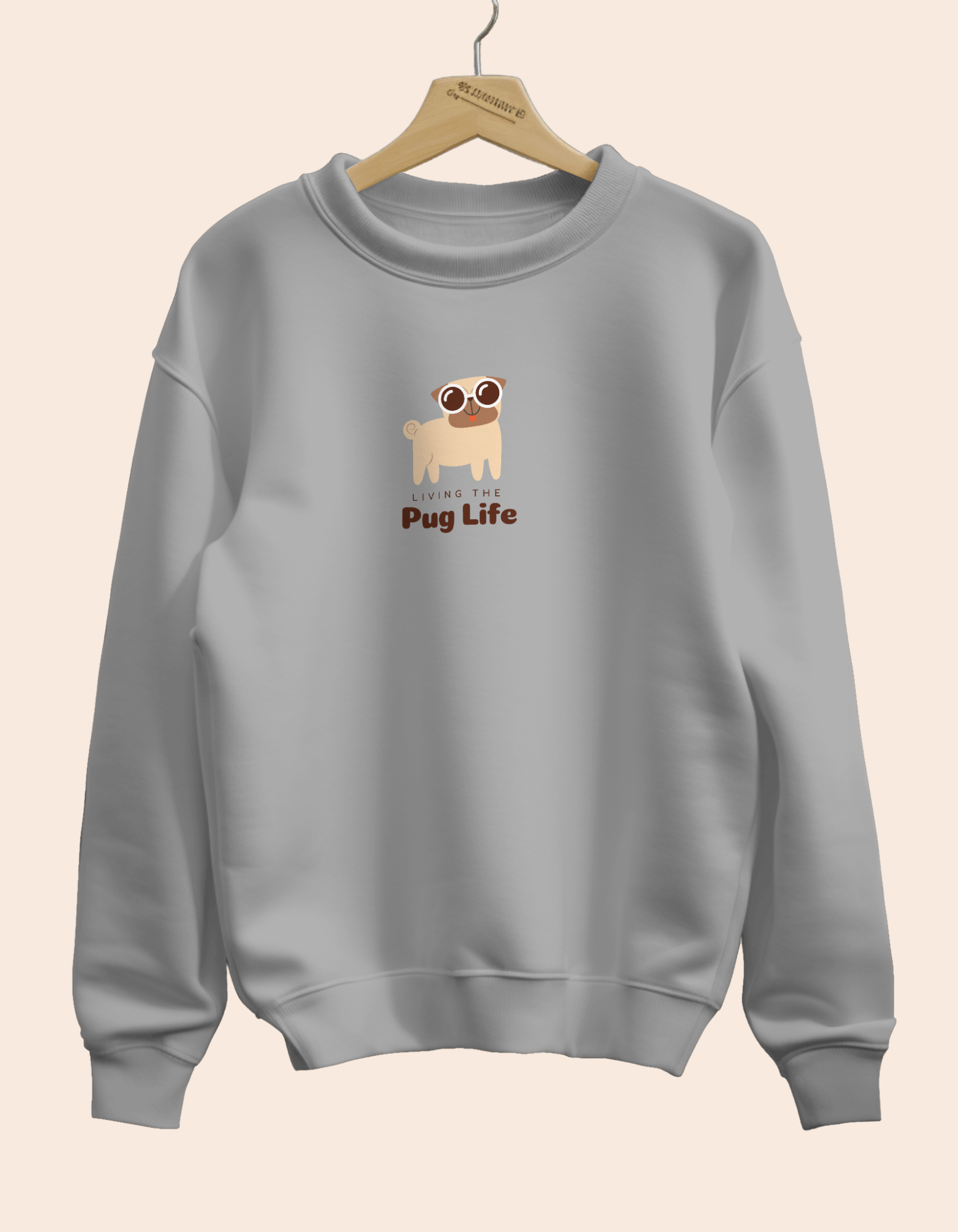 Wear your love for pugs with pride in this soft grey sweatshirt that’s as adorable as it is cozy. Featuring a cartoon pug with oversized eyes and the cheeky phrase “Living the Pug Life,” this piece is perfect for dog lovers who enjoy comfort with a side of fun